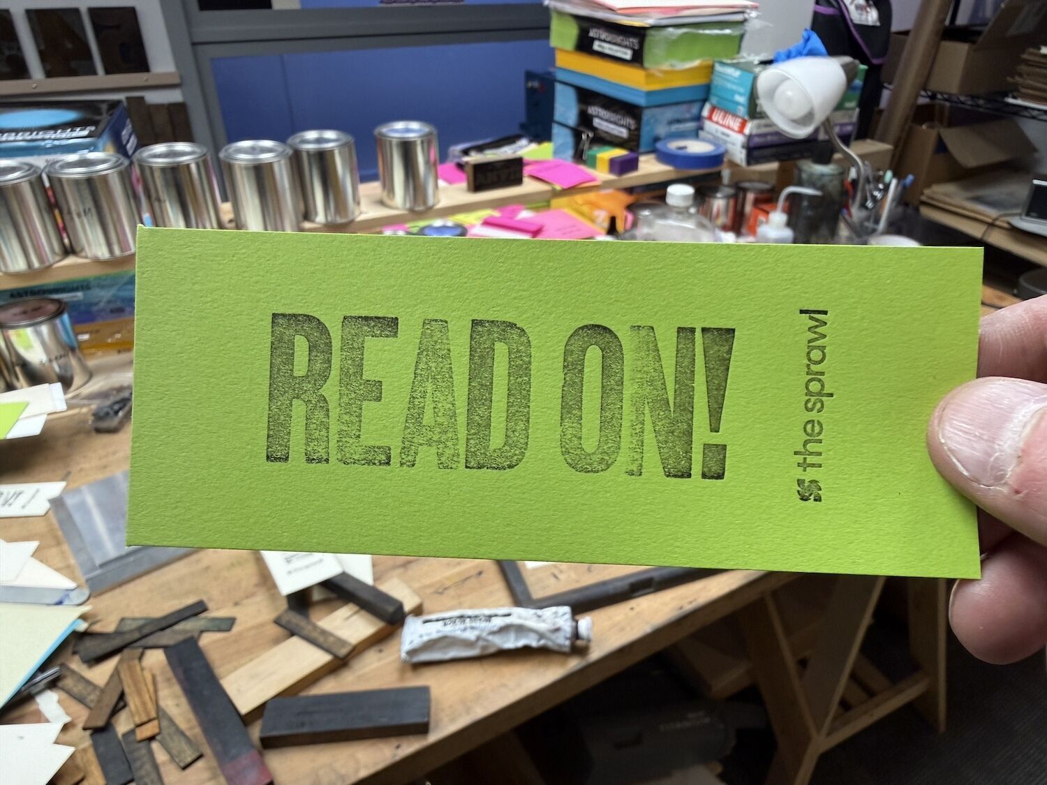 - Printing pop-up. The Sprawl will be at Shelf Life Books today (Saturday, April 25) from 11 a.m. to 1 p.m. for Canadian Independent Bookstore Day. There is coffee, there is music, there are books aplenty. And the first 100 people through the door get free ice cream or coffee. Swing by and print a bookmark with some wood type!
