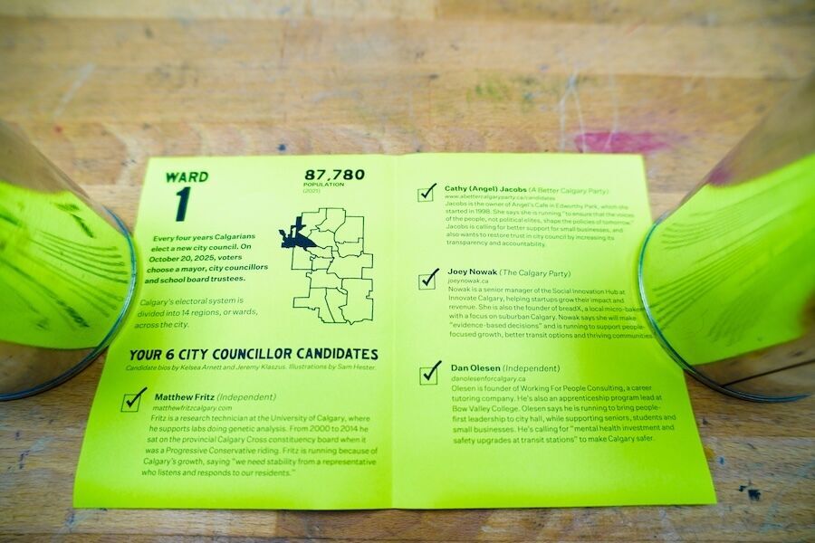 Here's how it works: We took The Sprawl's online candidate tracker—which Kelsea Arnett and I have been steadily updating since November—and made a series of print zines, one for each of Calgary's 14 wards.