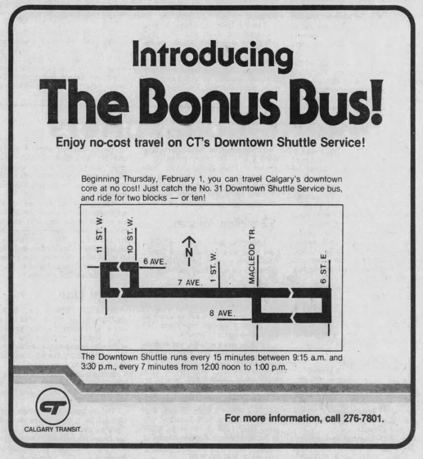 In 1979, to familiarize Calgarians with the idea of free transit downtown, city hall took a downtown bus shuttle and made it free for six months. At the time, Vancouver had a free downtown shuttle that was seen as a success.