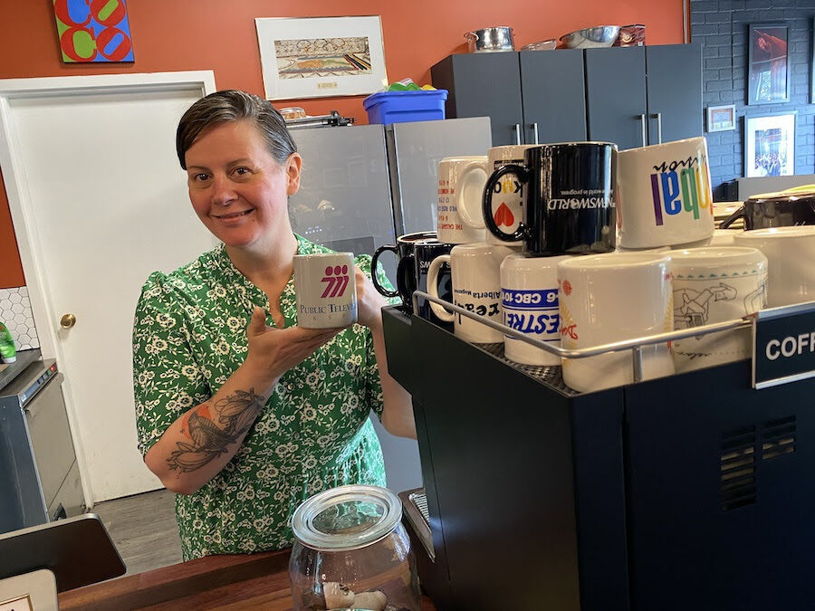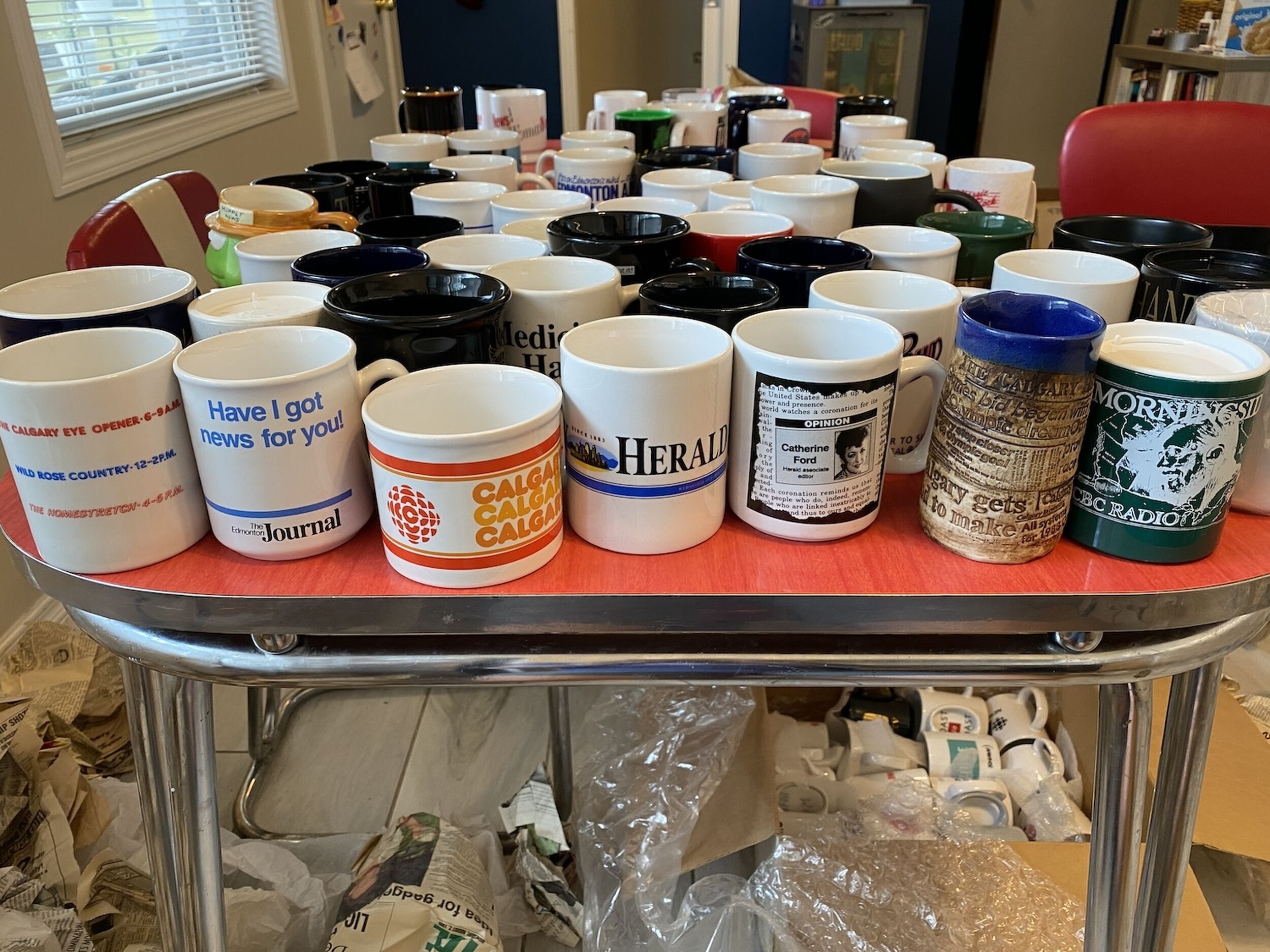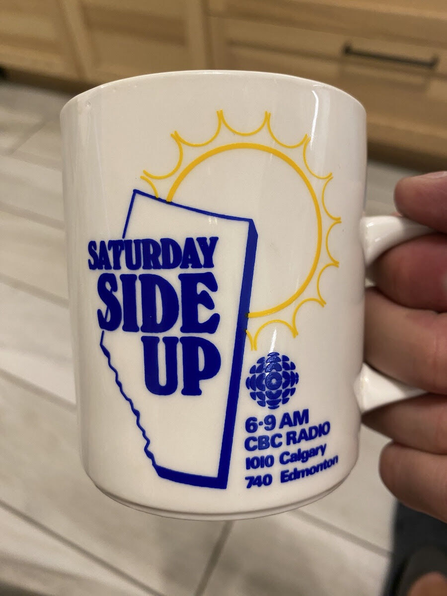 There were six boxes of mugs to go through—for various newspapers across Canada and for radio and TV programs. There were a ton of CBC mugs, including for specific local shows: The Eyeopener, The Homestretch, Daybreak Alberta.