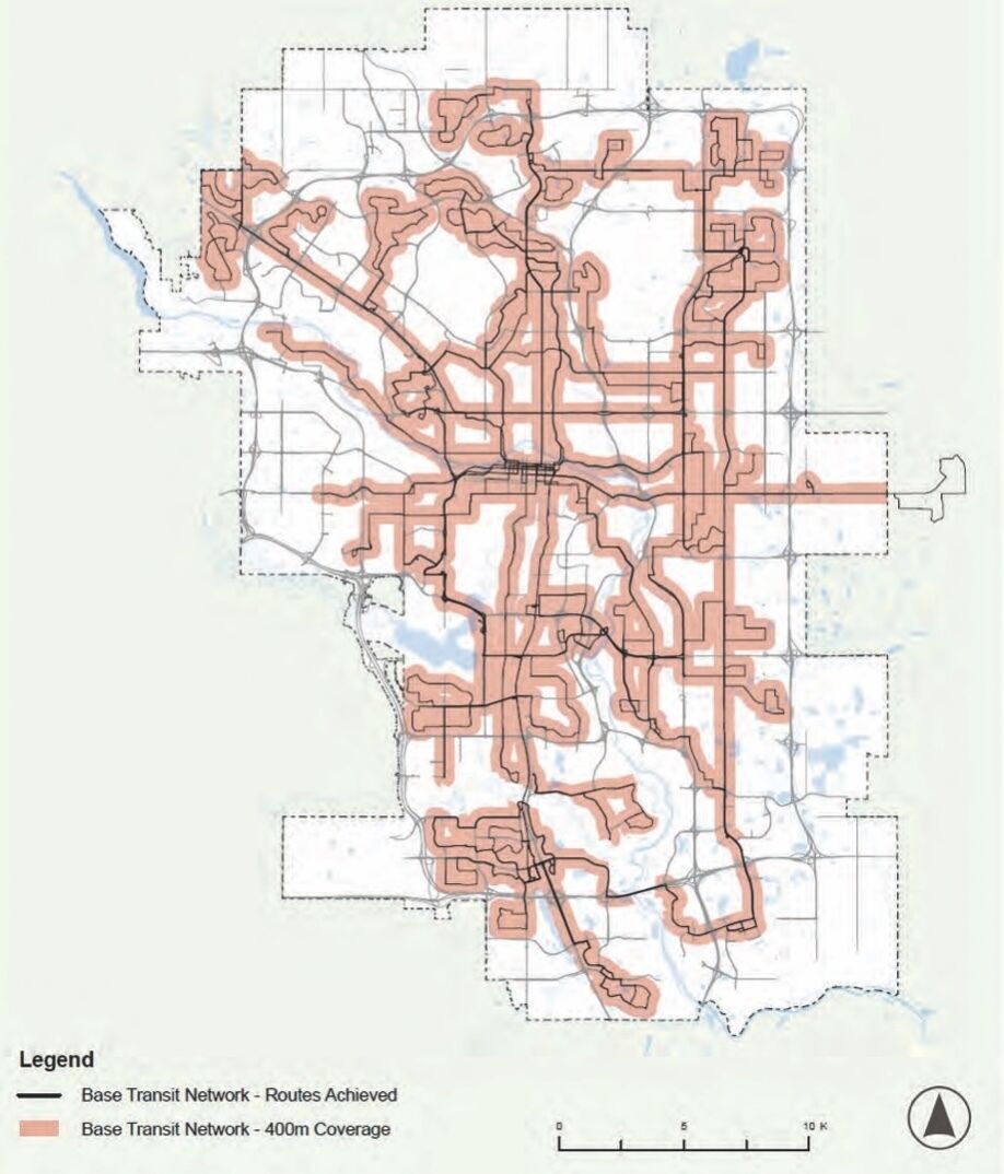 - In 2023, under the previous city council, Calgary Transit prioritized the primary transit network (fast and frequent routes) over base service (infrequent routes in most of the city). Only about 10% of Calgarians live within 400m of the primary transit network.