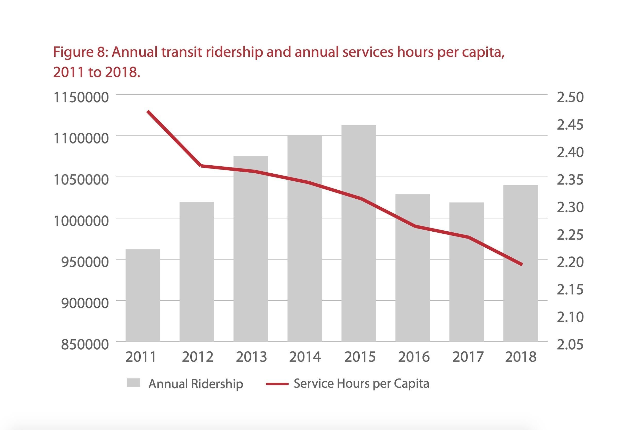 - In 2009, city hall set a 60-year goal of 3.7 transit service hours per capita, up from a baseline of 2.2. But this number has gone down, not up, as the city grows both in size and population—sliding from 2.4 service hours per capita in 2011 to 1.8 in 2024.