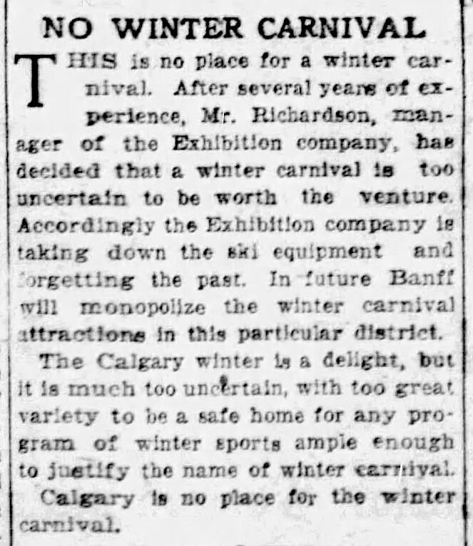 A story that ran in numerous U.S. papers stated that Calgary's Exhibition grounds were “a perfectly ripping site for winter sports” and that “the furs and automobiles of these crowds were convincing evidence of the prosperity of these happy westerners.”