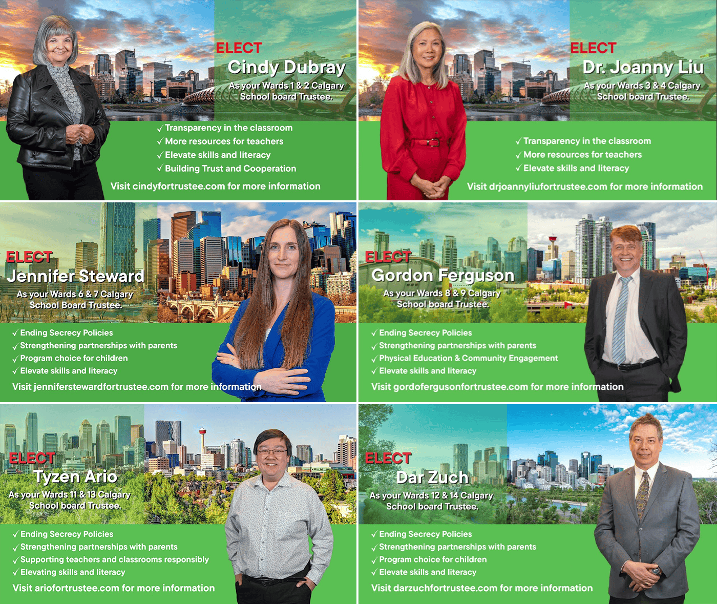 But some Calgarians have noticed that certain public school board trustee candidates in different parts of Alberta’s largest city have campaign materials that look identical and contain similar themes.