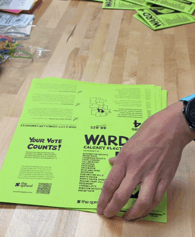 However you share our election zines, we'd love to hear about it—and see, too! Email us at hello@sprawlcalgary.com or send a text to Asad Chishti, our roving election reporter, at 587-998-4892.