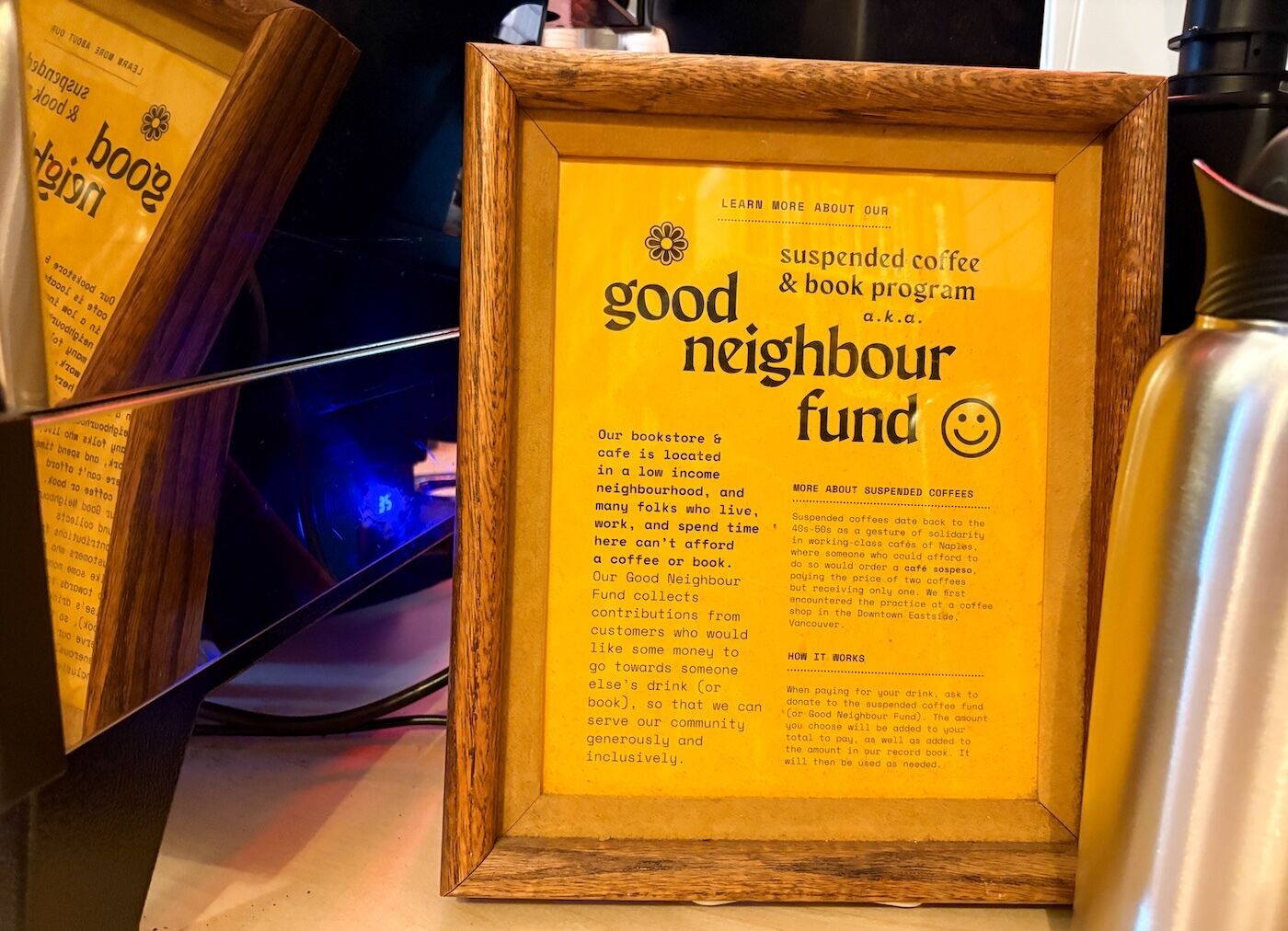 So some of the things that we started from the beginning were we had a community book fund. And now we’ve expanded that to be a book and coffee fund. So we would just have some money set aside. At first, we were doing it through the business, just ourselves. But now we have it where people can donate to our Good Neighbour Fund. They can donate, we’ll note the amount, and then we use that fund for folks who might wander in who would really love a coffee or really want to buy a particular book, but they don’t have the funds for that.